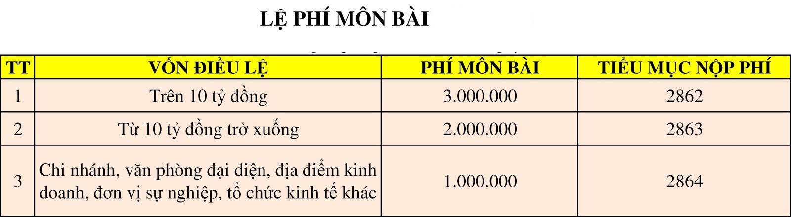 – Đối với chi nhánh, văn phòng đại diện, địa điểm kinh doanh, đơn vị sự nghiệp, tổ chức kinh tế khác thì mức lệ phí môn bài là 500.000
